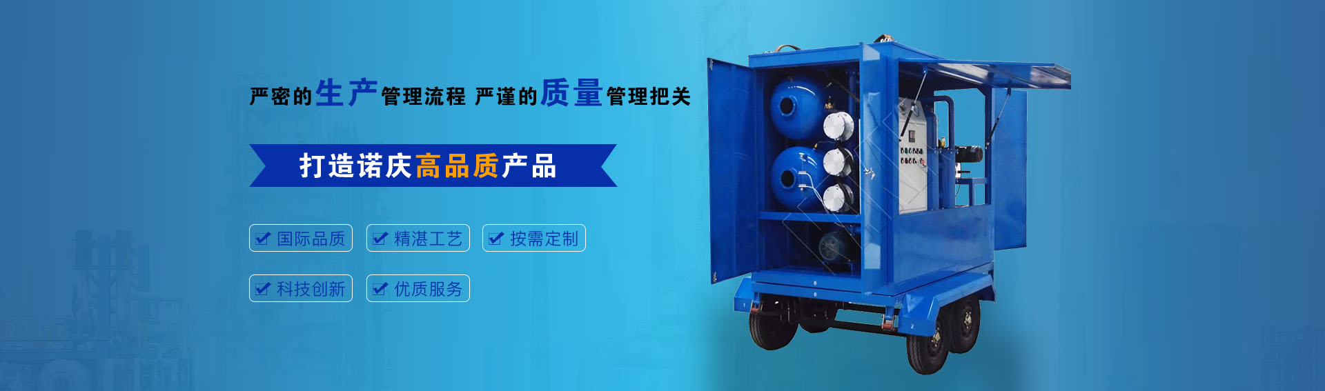 公司通過ISO9001-2015質量管理體系認證,CE歐盟認證,諾慶公司所有濾油機配套產品均采用國內外知名品牌,經過多年的使用,具有質量可靠,性能優(yōu)良。公司擁有完備的檢測儀器和檢測設備,所有產品出廠前經過嚴格測試,保證每一臺產品合格出廠。
